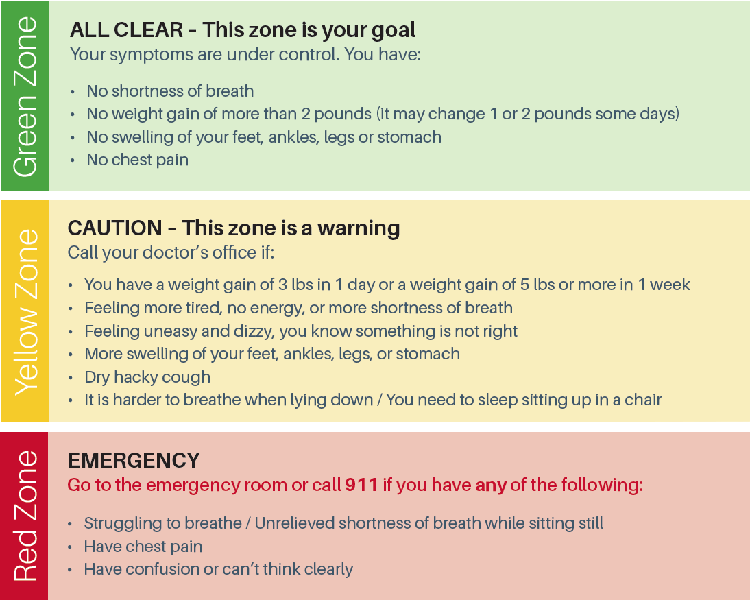 It’s important to check what zone your heart is in every day. Review your symptoms to determine if you are at your goal zone, warning zone or if you need to contact your cardiologist.